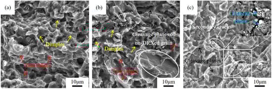 Figure 11 reveals the SEM morphology of room temperature tensile fracture with peak-aged Mg-xGd-4Y-1Sm-0.5Zr alloys. The fracture morphology with different Gd content shows different fracture characteristics, but the main fracture mechanism is quasi-cleavage fracture. The tensile fracture of GWS441 alloy is mainly composed of dimples, tearing ridges, and cleavage facets, and the dimples are deep (Figure 11a). The main difference between the fracture morphology of GWS741 alloy and GWS441 alloy is that the number of cleavage facets increases significantly, the dimples are fewer, and the fracture of un-DRXed grain with larger size can also be observed, as shown by the white circle in Figure 11b. The fracture morphology of GWS1041 alloy is mainly composed of many cleavage facets (Figure 11c). In addition, secondary cracks are found, which mainly originate from the enrichment of the eutectic phase, as shown by blue arrows in Figure 11c. These secondary cracks, as the source of stress concentration, will accelerate the main crack propagation and significantly reduce the strength. This also proved that the elongation of peak-aged GWS1041 alloy decreased significantly.