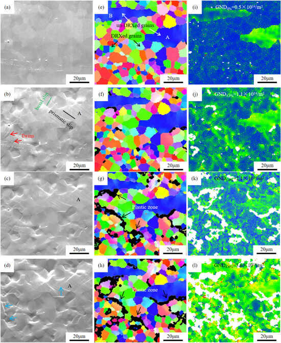 SEM images (a–d), IPF maps (e–h), and GND figures (i–l) of peak aged GWS741 alloy during the in situ tension process. (a,e,i) 0% strain; (b,f,j) 3.3% strain; (c,g,k) 5.0% strain; (d,h,l) 6.6% strain.