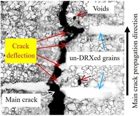Figure 13 illustrates the main crack propagation of peak-aged GWS741 alloy. It can be seen that the main crack propagates through un-DRXed grains, indicating that the propagation of the crack is hindered by the coarse un-DRXed grains, as shown in Figure 13. Many crack deflections can be observed, as shown by the red arrow. It shows a tortuous propagation path of the main crack, and the crack propagation resistance is large, resulting in a large plastic energy consumption, thus improving the fracture toughness during the whole process. Research shows that crack deflection and crack bridging usually reduce the driving force of crack propagation [50,51]. In addition, the tip of the main crack is around the un-DRXed grain, indicating that the crack propagation may be hindered by the un-DRXed grain, which improves fracture resistance.