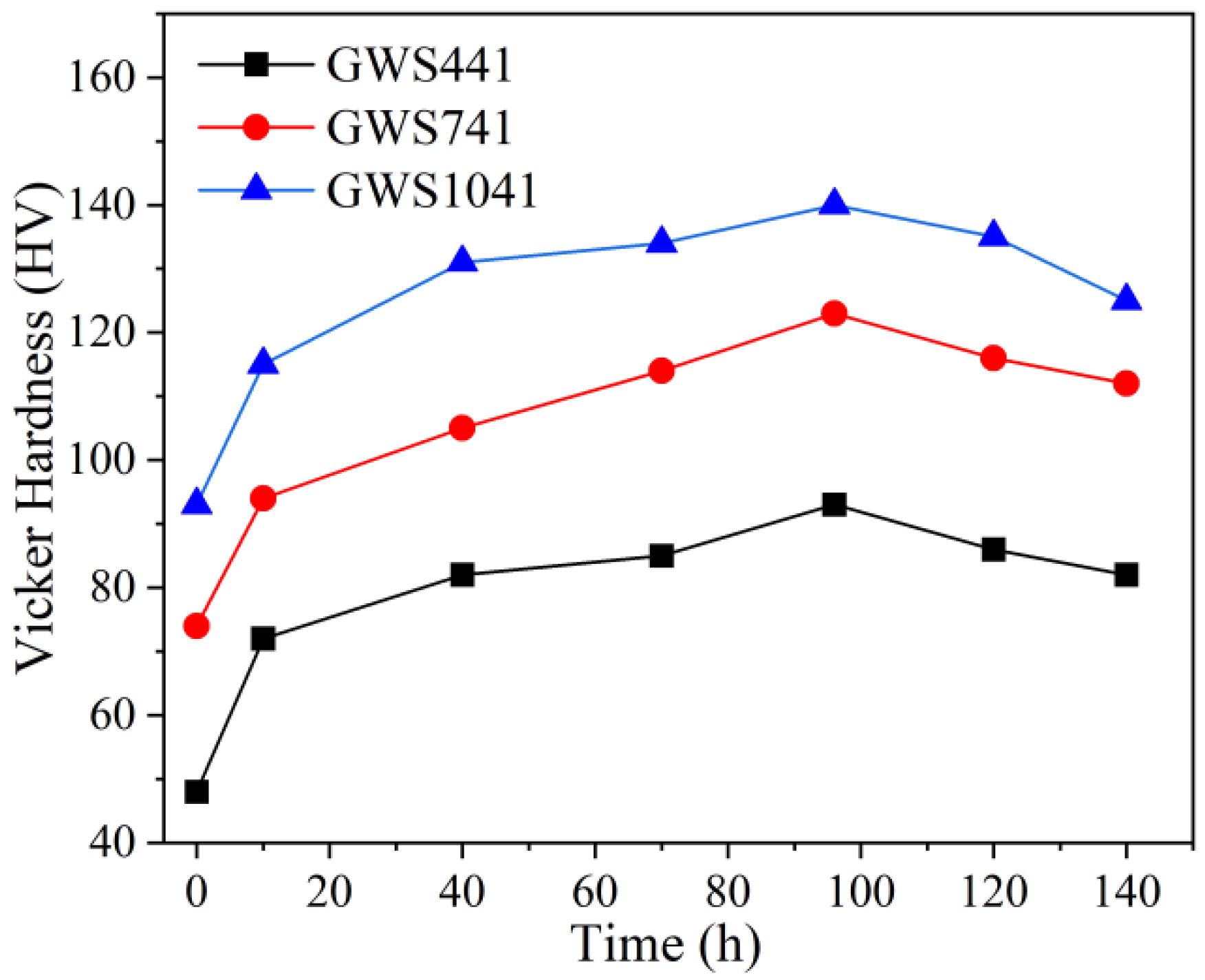 - After aging treatment (200 °C × 96 h), the hot extruded Mg-xGd-4Y-1Sm-0.5Zr alloys reach the peak hardness. As Gd content increases, the area number density of the β′ phase increases with Gd, being 7.1 × 1015/m2, 9.9 × 1015/m2, and 16.5 × 1015/m2, respectively. And the yield strength (YS) increases from 287 MPa to 345 MPa, the ultimate tensile strength (UTS) increases from 365 MPa to 418 MPa, and elongation (EL) decreases from 8.5% to 4.2%. The fracture mechanism is a quasi-cleavage fracture.