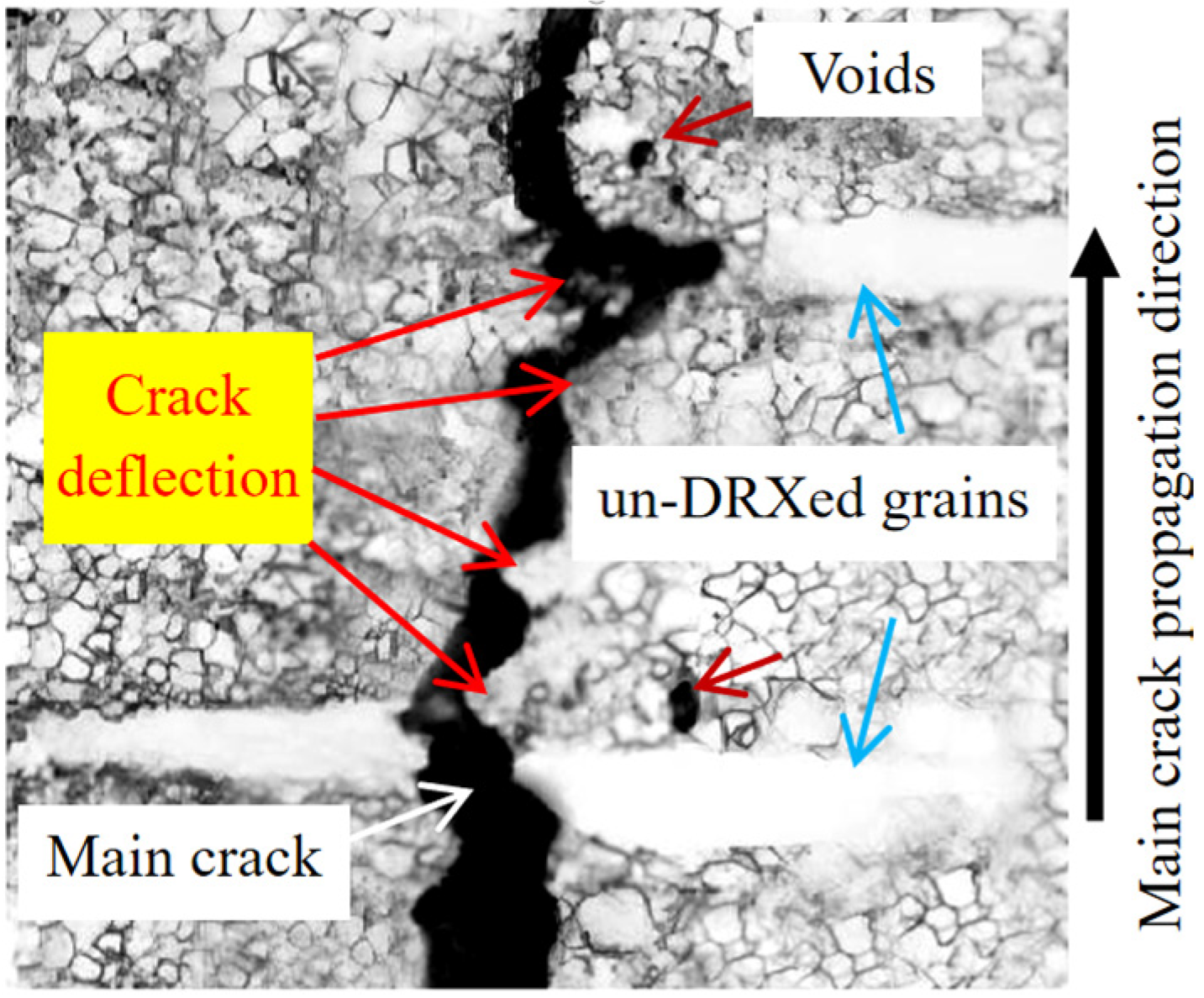 - The hot extrusion peak-aged GWS741 has the optimal performance, and the YS, UTS, and EL are 332 MPa, 409 MPa, and 7.8%, respectively. From the in situ experiment, the coarse un-DRXed grain occurs prismatic () slip, and the DRXed grains occur basal () slip and twin deformation. When the strain is 6.6%, there is still no micro-crack in the bimodal structure region, showing high plasticity. During the tensile failure process, the main crack propagates along a zigzag path, forming the crack deflection, and the main crack passes through the long un-DRXed grain and bypasses the un-DRXed grain.