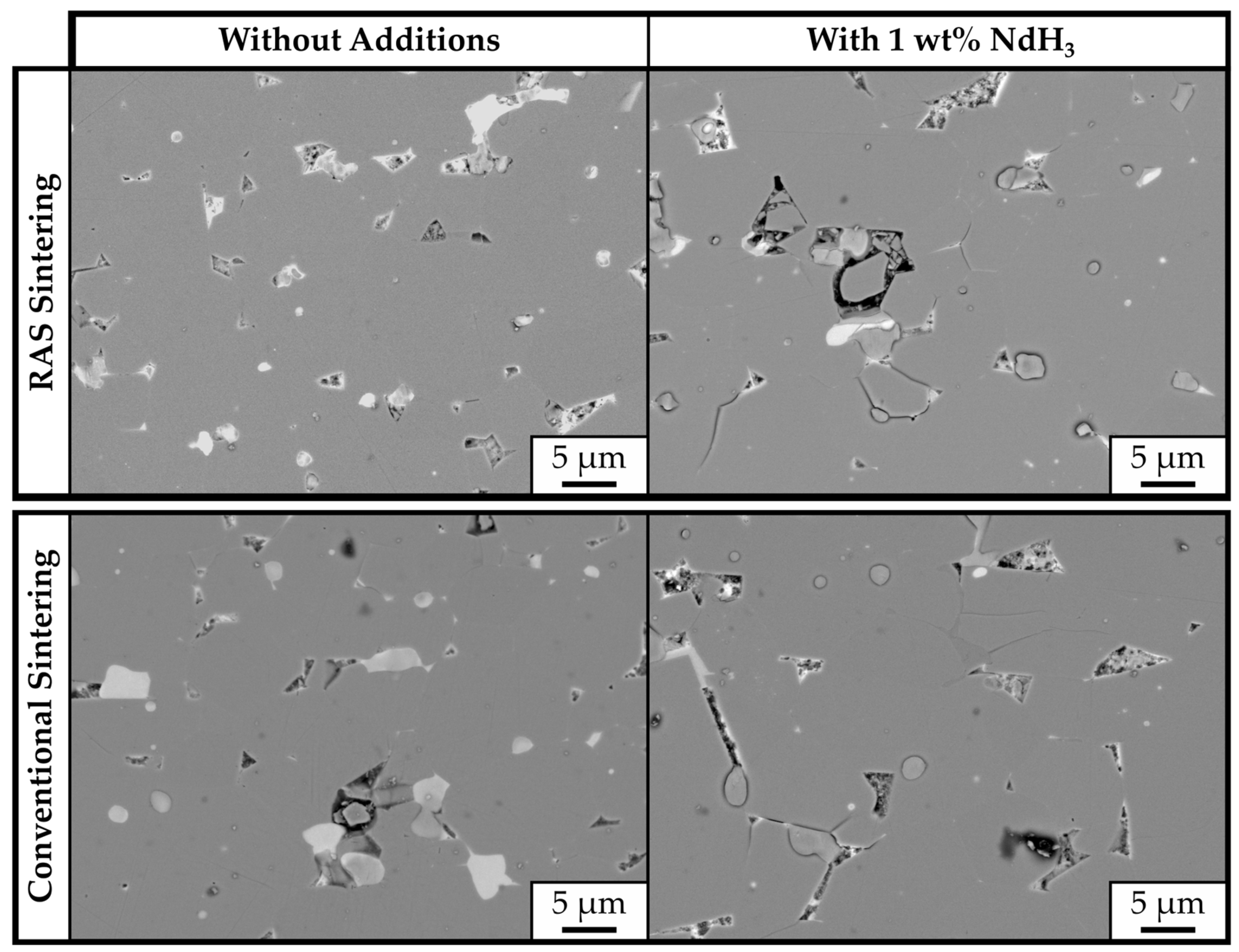 - Tomše, T.; Ivekovič, A.; Kocjan, A.; Šturm, S.; Žužek, K. A Rapid Thermal-Radiation-Assisted Sintering Strategy for Nd–Fe–B-Type Magnets. Adv. Eng. Mater. 2024, 26, 2401404. [Google Scholar] [CrossRef]