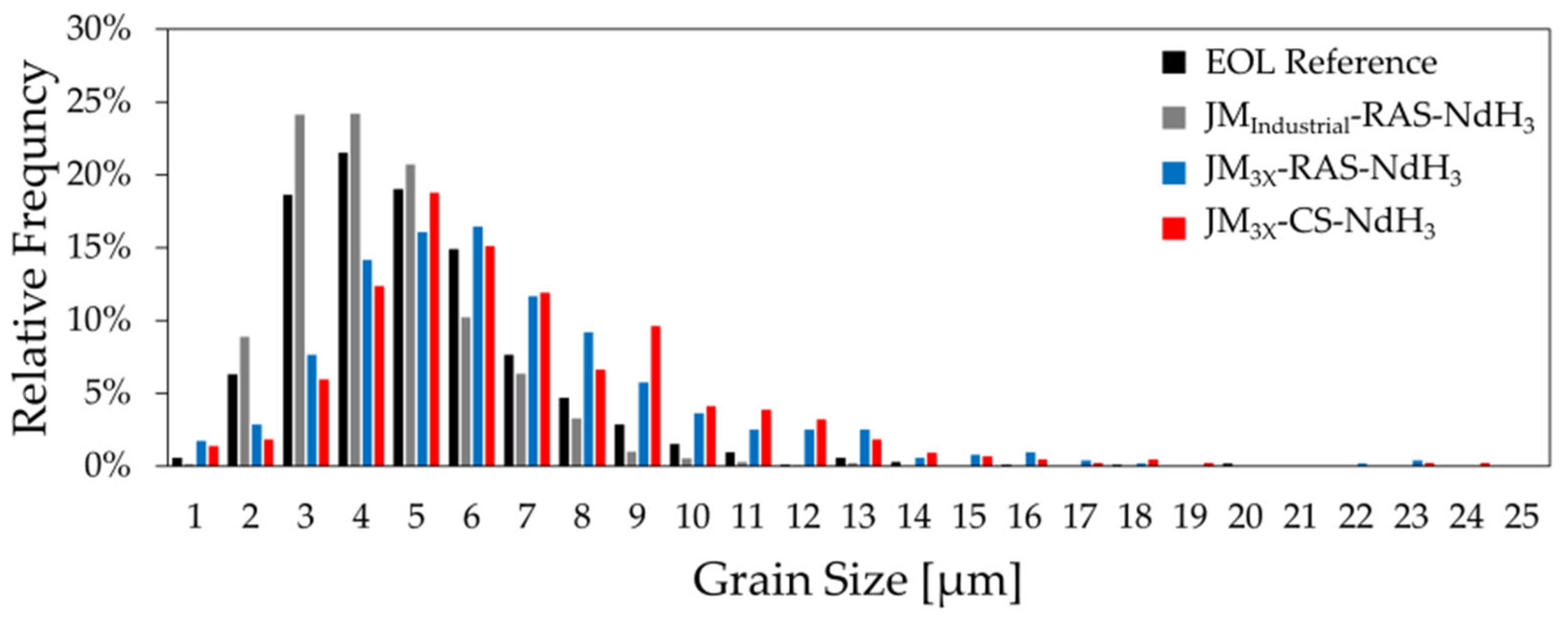 - Sarriegui, G.; Martín, J.M.; Burgos, N.; Ipatov, M.; Zhukov, A.P.; Gonzalez, J. Effect of Particle Size on Grain Growth of Nd-Fe-B Powders Produced by Gas Atomization. Mater. Charact. 2022, 187, 111824. [Google Scholar] [CrossRef]