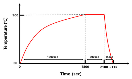 The base metal (BM) used in this study was a 30MnB5 hot-stamping steel sheet with a thickness of 1.2 mm. The chemical compositions listed in Table 1 were determined using electron probe micro-analyzer (EPMA) on a JXA-8530F instrument (JEOL Ltd., Akishima, Tokyo, Japan), following the ASTM E1508-12a standard [31]. Accordingly, in order to simulate the actual hot-stamping process, the sample was heated from 20 °C to 900 °C over ~30 min in a vertical electric furnace (3S ENG Co., Ltd., Busan, Republic of Korea), following the heat-treatment cycle shown in Figure 1. This was followed by holding at 900 °C for 5 min and water cooling for 15 s.