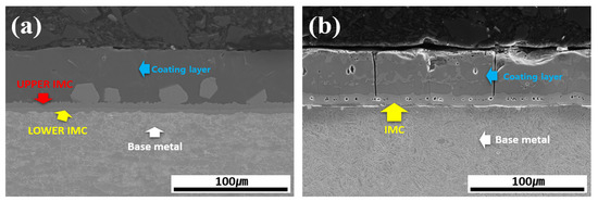 Figure 3 shows the cross-sectional morphology of the Al–Si-coated 30MnB5 BM specimen before and after HT. Prior to HT, the cross-section consisted of four layers: coating layer, upper IMC, lower IMC, and BM. The coating layer displayed an Al–Si coating morphology with a smooth surface and uniform thickness. After HT, the coating layer exhibited an uneven surface and variable thickness accompanied by the formation of new compounds within the coating layer. Furthermore, the previously distinct upper and lower IMC layers merged into a single IMC layer, resulting in a three-layer structure composed of a coating layer, IMC, and BM.