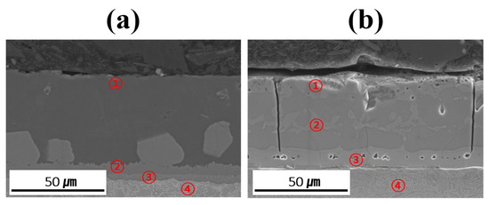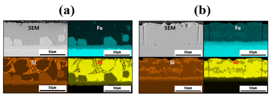 Table 3 summarizes the chemical compositions of the coating layer, IMC, and BM in each specimen before and after Zn coating and HT. The relative concentration trends of Al, Si, and Fe in each layer were determined using EDS point analysis to verify and support the findings of the EPMA mapping analysis. However, owing to the limitations in absolute quantification, the EDS data were only used to roughly compare the elemental distributions in the coating layer, IMC, and BM. The measurement locations provided in Table 3 are indicated by red numbers in Figure 8. The coating layer of each specimen was analyzed near its upper surface to confirm the presence of Zn. Before HT, the IMC layer was divided into upper and lower parts, whereas in the heat-treated specimens, Fe–Al–Si compounds were formed within the coating layer; thus, two regions were analyzed in each case. Evaluating the component behavior of each specimen (Al–Si-and Al–Si–Zn-coated) before and after HT revealed that the chemical compositions of each region (coating layer, IMC, and BM) were consistent with the component segregation observed in the previous EPMA analysis.