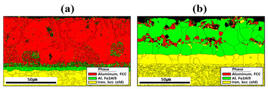 Figure 5 shows the EBSD phase maps used to analyze the crystal structures of the coating layer, IMC, and BM before and after HT. The results indicated that compounds formed within the coating layer, and the primary phases were aluminum (face-centered cubic: FCC), Fe2Al5 (orthorhombic), and iron (body-centered cubic: BCC) near the coating layer. Before HT, most of the Al and Si are segregated within the coating, and Si is relatively depleted in the regions where Al is predominantly segregated as shown in Figure 4a [33]. Therefore, in the regions where Al is mainly segregated, aluminum with an FCC structure is observed, whereas in the regions where Si is mainly segregated, it appears that Si has precipitated from the aluminum matrix. The division into upper and lower IMC layers shown in Figure 3a is attributed to the degree of Fe dilution, as illustrated in Figure 4a. This distinction is also evident in Figure 5a, where the IMC layer is differentiated according to the extent of Al combining with Fe to form Fe2Al5 [34]. In addition, the BM is composed of BCC-structured Fe. After HT, Fe from the BM diffused into the coating layer, and Fe2Al5 became the dominant phase throughout the layer. During this process, the proportion of FCC aluminum decreased, indicating that HT altered both the chemical composition and microstructure of the coating layer. In the BM of Figure 6b, the microstructure appears to have been refined by heat treatment and rapid cooling, which can be attributed to a phase transformation from ferrite to martensite [34,35].