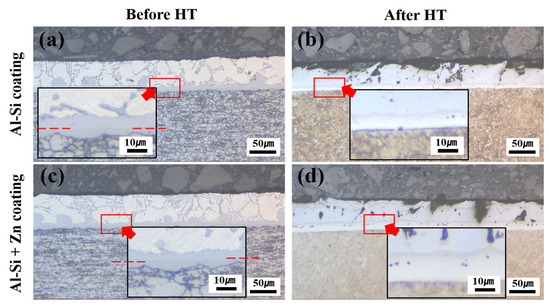 Morphologies of the coating layer, IMC, and BM in each specimen: (a) Al–Si-coated specimen before HT, (b) Al–Si-coated specimen after HT, (c) Al–Si + Zn-coated specimen before HT, and (d) Al–Si + Zn coated specimen after HT.