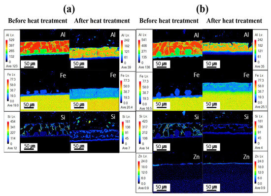 EPMA-based mapping analysis for each specimen before and after HT: (a) Al–Si coating, (b) Al–Si + Zn coating layers.