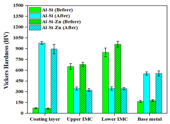 Average hardness values of the coating layer, IMC, and BM in Al–Si-coated and Al–Si + Zn-coated specimen before and after HT.