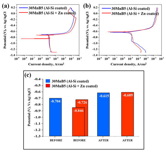 Figure 10b shows that the corrosion potential of the Al–Si + Zn-coated specimen decreased in one potential step following HT. Both specimens demonstrated an increasing trend in corrosion potential up to −0.6 V. During the heat-treatment process, Fe from the substrate diffused into the Al–Si coating, forming an Fe–Al–Si intermetallic compound. The ~100 mV increase in corrosion potential following HT is primarily attributed to microstructural changes within the coating, such as Fe–Al interdiffusion and the formation of Fe2Al5 intermetallic compounds, which alter the overall electrochemical activity of the surface. These reactions also promote the formation of a mixed oxide layer composed mainly of Al2O3, ZnO, and Fe2O3, which further stabilizes the surface [38,39]. Notably, the oxide layers in the Al–Si + Zn-coated specimen likely developed more extensively than those in the Al–Si-coated specimen owing to the 500 s stabilization period prior to the experiment.