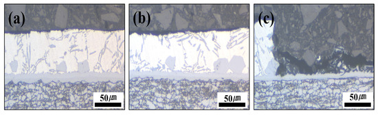 Cross-section photographs of the Al–Si + Zn-coated specimen by interrupting the polarization at three potential stages: (a) −800 mV, (b) −650 mV, and (c) −500 mV.