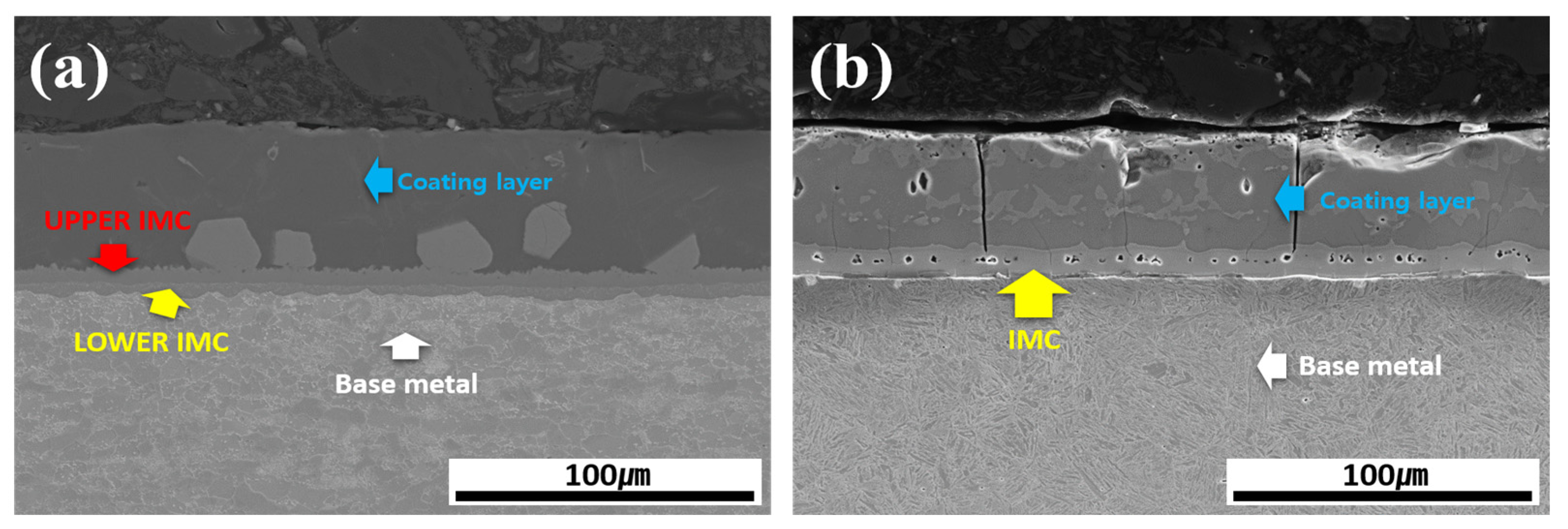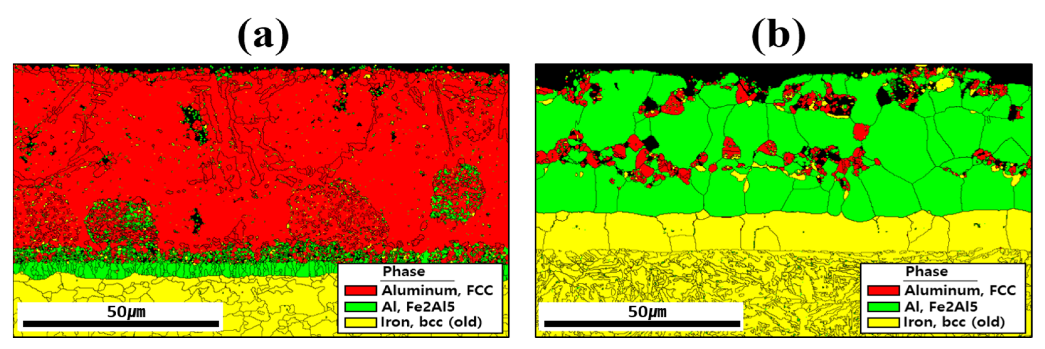 - Kim, B.J.; Lim, H.Y.; Kayani, S.H.; Lee, Y.S.; Kim, S.H.; Cha, J.H. Formation and Evolution of Interfacial Structure in Al-Si-Mg/Stainless Steel Bimetals during Hot-Dipping Process. Crystals 2024, 14, 387. [Google Scholar] [CrossRef]
