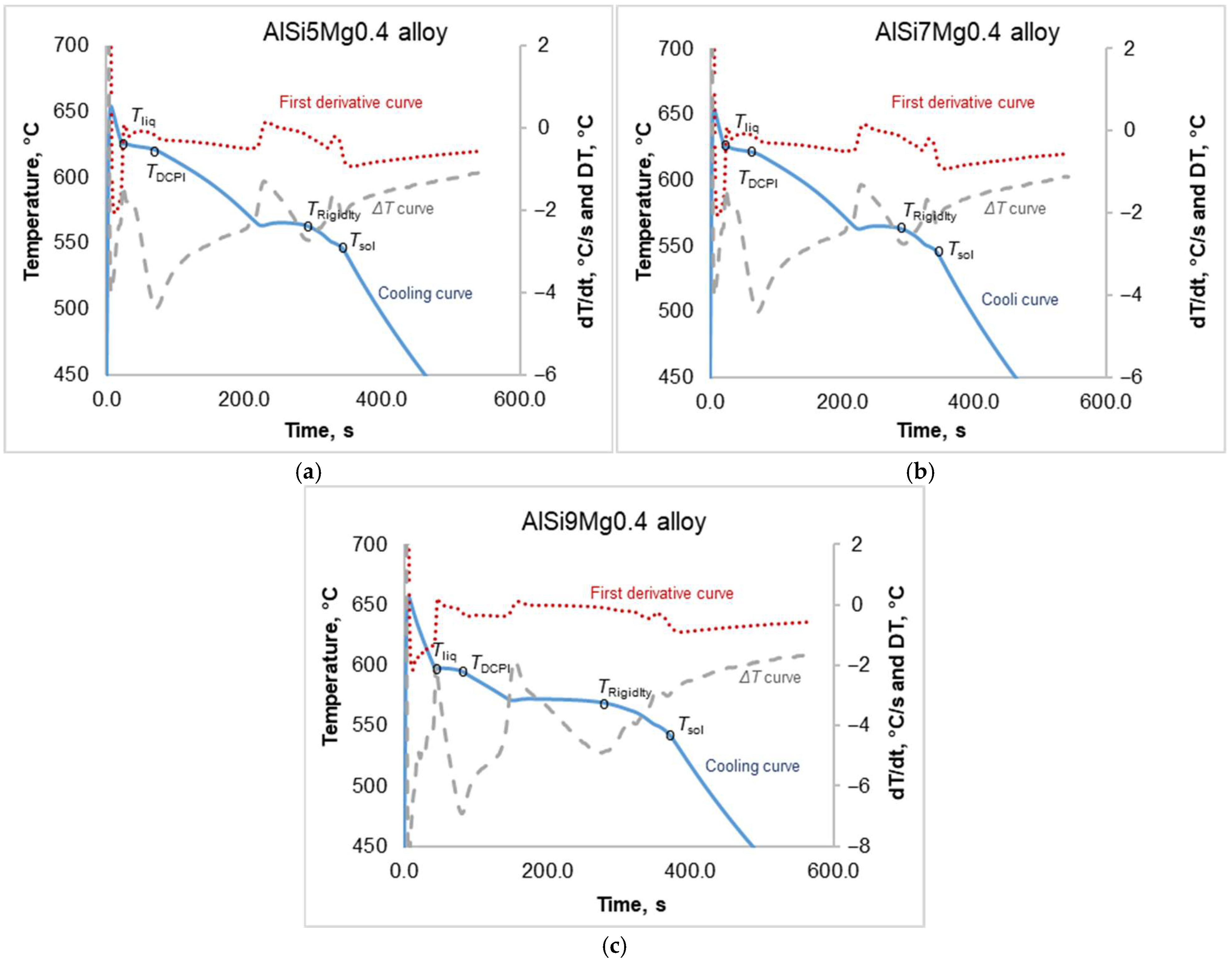 20], increasing the silicon content in hypoeutectic Al-Si-Mg alloys from 5.1 to 8.9 wt.% lowers the dendrite coherency temperature by 24 °C. This result agrees well with the findings of this study. These changes significantly influenced the onset of mass and interdendritic feeding.
