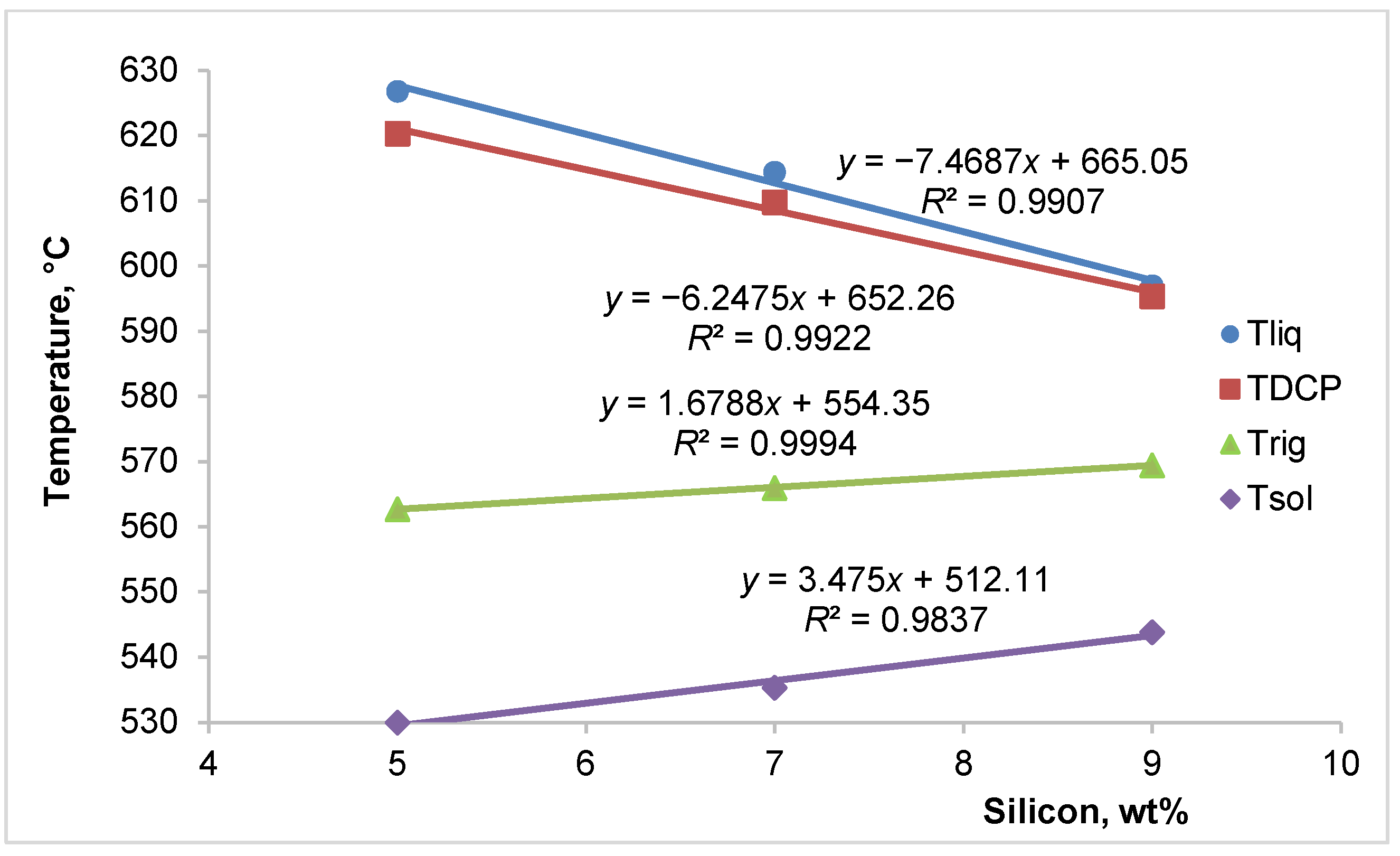 Figure 4 presents the influence of various silicon contents on the characteristic solidification temperatures of AlSi(5-7-9)Mg0.4 alloys. This figure shows that an increase in silicon content significantly lowered the liquidus and dendrite coherency temperatures while slightly increasing the rigidity and solidus temperatures. An increase in silicon content of up to 4 wt.% decreased the liquidus temperature by 29.8 °C and the dendrite coherency temperature by 25 °C.
