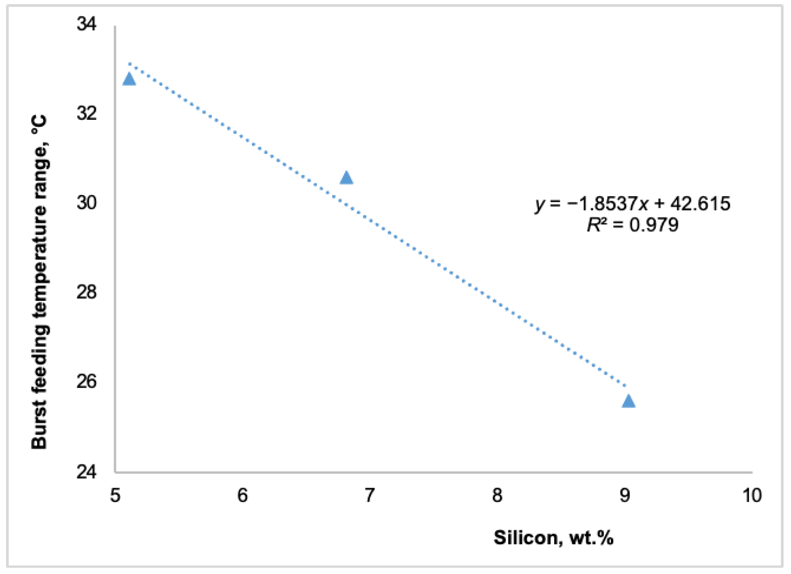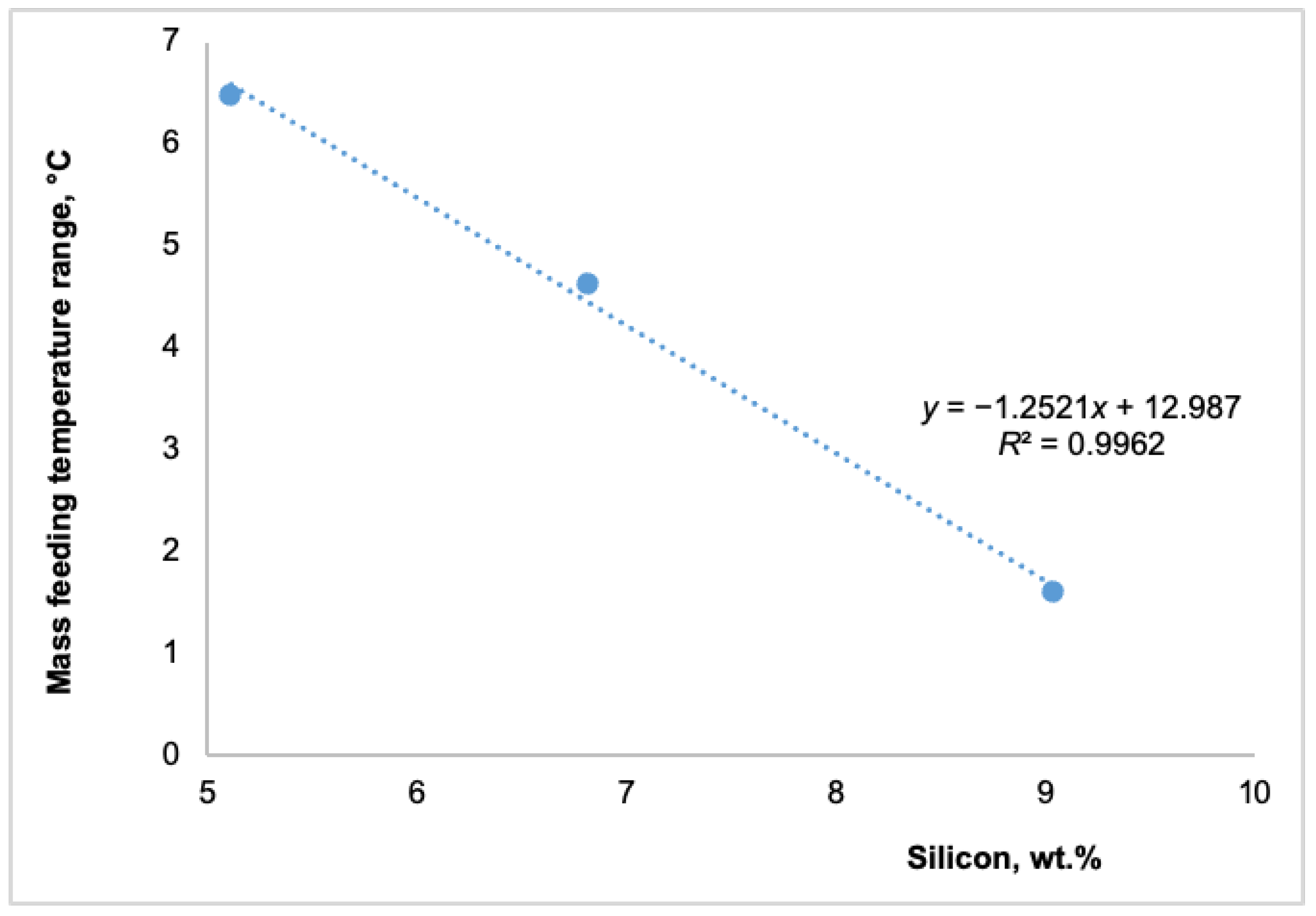 Using Equations (1)–(3) and calculating the corresponding temperature ratio for various feeding regions, the impact of silicon was quantified and is presented in