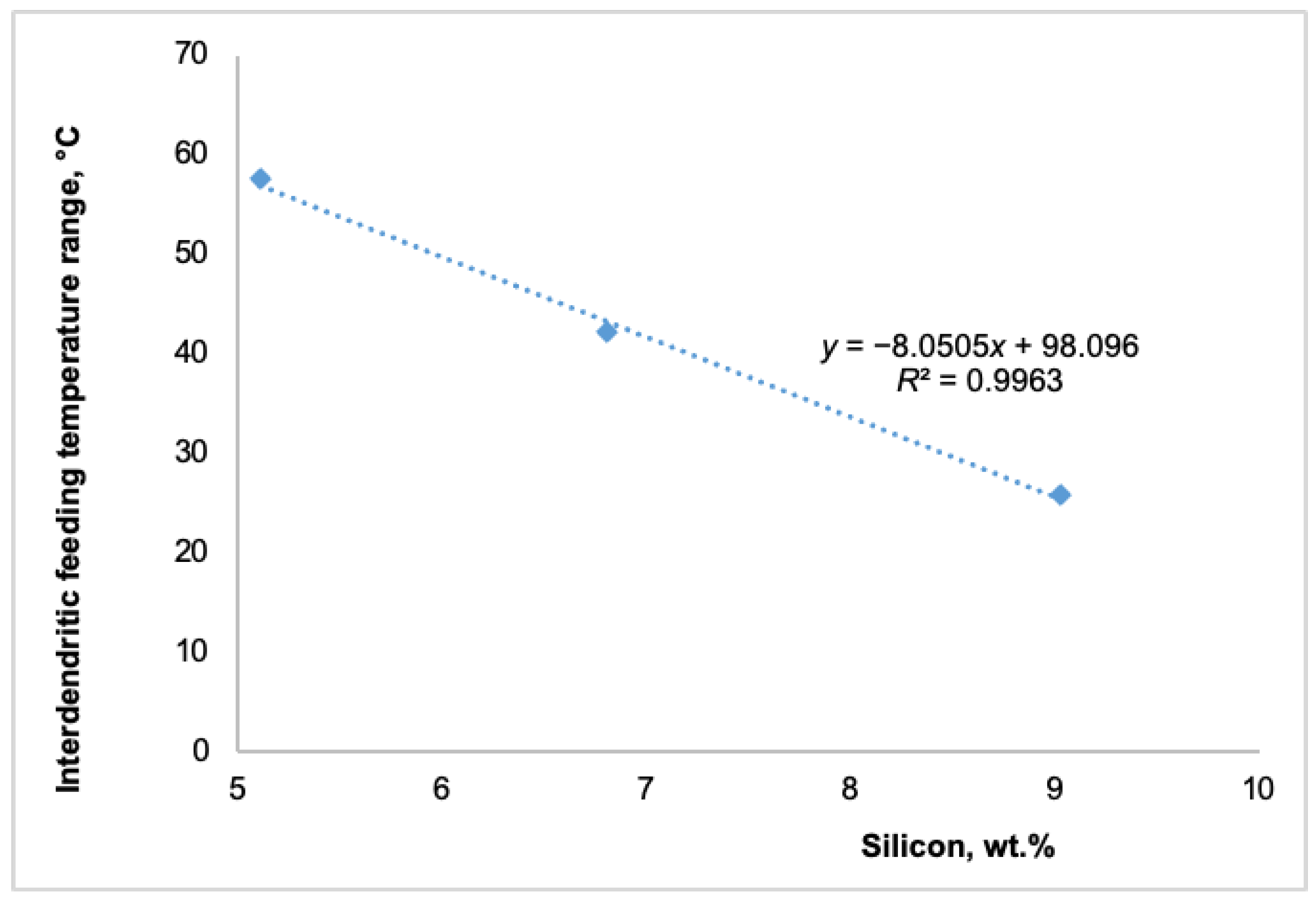 19] and foundry experience indicate that silicon significantly influences the feeding ability of hypoeutectic Al-Si alloys by affecting the solidification process and resulting microstructure. Increased silicon content generally improves the feeding ability by narrowing the freezing range and enhancing fluidity [