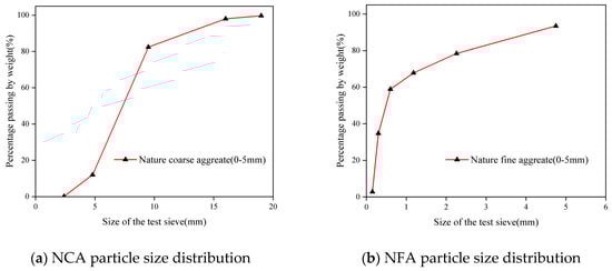 Natural coarse aggregate (NCA) was obtained from natural pebbles in China’s Xinjiang region with continuous grading of 5~20 mm in diameter. The natural fine aggregate (NFA) is washed medium-coarse sand from the Xinjiang region, with a fineness modulus of 2.54 and a water content of 3.73%. The particle size distribution of the aggregate is shown in Figure 1; the DS is taken from the Taklamakan Desert, with a fineness modulus of 0.122, an average grain size of 0.118 mm, a bulk density of 1334 kg/m3, an apparent density of 2790 kg/m3, and a water content of 0.4%, and the chemical compositions are tabulated in Table 1. The distributions of their grain sizes are shown in Table 2. The cement employed (P.O. 42.5, China Construction Western Engineering Co., Ltd., Xinjiang, Ürümqi, China) possessed a specific surface area of 350 m2/kg. Fly ash (China Construction Western Engineering Co., Ltd.) exhibited a specific surface area of 330 m2/kg. Granulated blast furnace slag powder (Henan Dingnuo Purification Materials Co., Ltd., Gongyi, Henan, China) comprised finely ground granulated blast furnace slag with a specific surface area of 430 m2/kg. Table 3 lists the principal oxide constituents detected in the three cement materials via Rigaku X-ray fluorescence (XRF) analysis in Tokyo, Japan. Tap water was employed for the experiments; the water-reducing agent (Sichuan Dongrun Baisheng New Materials Co., Ltd., Chengdu, Sichuan, China) was dosed at 4.47 g per cubic metre.