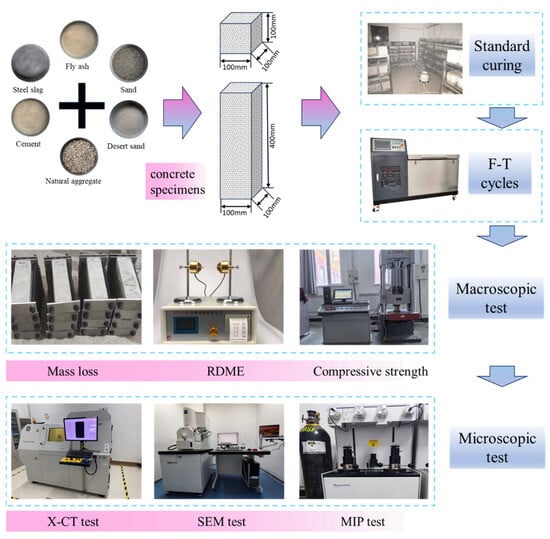 Figure 2 depicts a schematic representation of concrete specimen fabrication and outlines the laboratory apparatus used. Initially, the material was placed in a twin-shaft mixer and stirred then poured into a 100 mm × 100 mm × 100 mm cube mould and a 100 mm × 100 mm × 400 mm prism mould and vibrated to flatten it to make a test sample. After moulding, the specimen shall be immediately covered with an impermeable film. Following a 24 h rest period at 20 ± 5 °C, it shall be removed and transferred to a standard curing chamber for 24 days of curing (temperature 20 ± 2 °C, humidity ≥ 95%). Subsequently, freeze–thaw cycling tests (FTC) shall be conducted in a freeze–thaw testing machine.