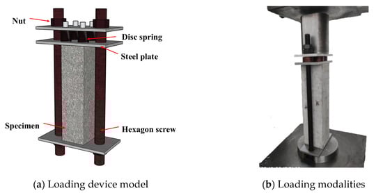 Figure 3 illustrates the continuous loading apparatus and the loading procedure. The structure of the loading device includes three steel plates at the top, middle, and bottom, two bolt rods, butterfly springs, and customized nuts. Round holes were left at the ends of the loading plates to facilitate the later passage of the bolt rods, and a 100 mm × 100 mm scale was drawn in the middle of the bottom loading plate to determine the position of the concrete test block.