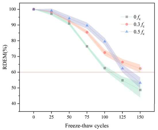The RDEM of desert sand concrete is evaluated as the deterioration index of its service life prediction under different freeze–thaw cycles, and the formula is shown in the following Equation (11):