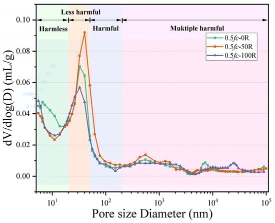 The pore size distribution of desert sand concrete after 0, 50, and 150 freeze–thaw cycles at 0.5 fc is shown in Figure 8. Wu & Lian [] classified the pores of concrete into four categories based on their diameters: those with pore diameters less than 20 nm are harmless pores, those with pore diameters between 20 nm and 50 nm are less harmful pores, those with pore diameters between 50 nm and 200 nm are harmful pores, and those with pore diameters more significant than the pore diameter of more than 200 nm are harmful pores. For the specimen with certain stress, with the increase in FTC times, the number of harmless pores with 50 times and 150 cycles is lower than the initial specimen. The number of less harmful pores with a pore size of 20 nm~50 nm is the most in the specimen with 50 times the FTC, which is because, with the FTC, the external water enters into the pore space of the cement paste and condenses and forms ice to make the pore space expand. After the melting of ice crystals, there is residual deformation in the form of pore shrinkage, which will gradually coarsen the pore structure of the cement paste. In this process, harmless pores will be expanded into less harmful pores, and the less harmful pores will be expanded into harmful pores. It is evident that the FTC exerts a gradual coarsening effect on the pore structure of the cement paste, with the coarsening effect generally occurring in pores with a diameter of 10 nm and above.