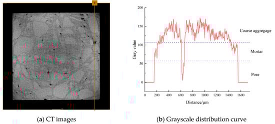 CT scans were performed on DSC specimens subjected to 0.5 fc stress after undergoing 0, 50, and 150 FTC. The 2D slice images of the samples were obtained by scanning. The first step of image processing was noise reduction, and then the grey ranges of pores, mortar, and aggregate were differentiated according to the grey value. Figure 10a shows the drawing of a straight line in the two-dimensional slice image of the DSC through the mortar, aggregate, and pore position to draw a line segment. As illustrated in Figure 10b, the grey value of different phases in different subgroups varies, indicating that the range of grey values for each phase is distinct. Utilizing the grey values of 110 and 60, respectively, for the segmentation of mortar, coarse aggregate, and pore, it can be observed that when the grey value is less than 60, it can be identified as pores. Conversely, when the grey value ranges from 60 to 110, it can be identified as mortar, and values above 110 are indicative of coarse aggregate. Then, a three-dimensional reconstruction of member pores is carried out. Taking DSC subjected to a high-stress state as an example, Figure 11 shows the 3D model of pores after segmentation.