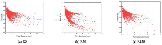 The more the sphericity approaches 1, the more the pore form resembles a sphere. Poor sphericity of the pore structure may lead to localized stress concentrations at the pore margins, thus impacting the mechanical characteristics and durability of the concrete. To further examine the impact of FTC on the sphericity of pores in DSC under applied stress, the sphericity of pores in specimens subjected to 0, 50, and 150 FTC was assessed. Figure 12 illustrates a substantial negative association between pore sphericity and both pore volume and diameter, indicating that bigger pores exhibit less sphericity. This indicates that the larger the pore diameter, the greater the irregularity of the pores, which increases the stress concentration in the concrete. Consequently, the concrete is more susceptible to cracking and further deterioration due to this high-stress concentration.