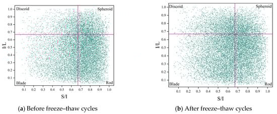 To examine the impact of FTC on pore shape, the shape factor parameter was used to assess the pore morphology of concrete specimens before and after FTC. The shape factor is a measure of pore morphology determined by the ratio of elongation to flatness in three dimensions. Two pore morphology parameters, the flatness index (S/I) and the elongation index (I/L), were computed to quantitatively describe the three-dimensional pore morphology of DSC. The flatness index denotes the ratio of void thickness S to width I, whereas the elongation index signifies the ratio of void width I to length L. A ratio of 0.67 served as the threshold for classifying the pores in the concrete into cake, sphere, blade, and rod forms []. A greater ratio corresponds to a more complete pore morphology, while lower values of either or both indices indicate more flattened and elongated pores. Table 5 illustrates the classification of form factor indices.