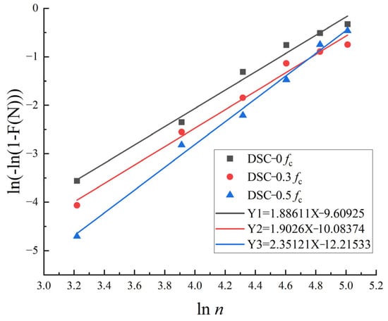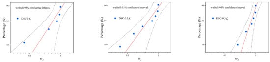Weibull operations were performed by combining Equations (6)–(11), and Weibull analysis was performed to obtain the values of Weibull parameters A and B for DSC under different stress states, as shown in Table 7: