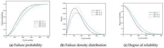 Figure 17b shows the failure density function of the test specimen, which represents the macroscopic failure process of the material. As the curve peak increases and the span decreases, material degradation increases. Comparing the DSC specimens under different stress states, the sensitivity to FTC is still the largest for high stress, the second for no stress, and the smallest for medium stress, which also argues the previous analysis. Specimen reliability, which has a complementary relationship to specimen failure probability, is shown in Figure 17c. The higher the likelihood of the sample failing, the less reliable it is. Within 500 FTC, the reliability of all specimens decreases rapidly, with the fastest decrease in the DSC-0 group and the slowest decrease in the DSC-0.3 group, and the difference reaches a maximum of 27.86% at 199 FTC.