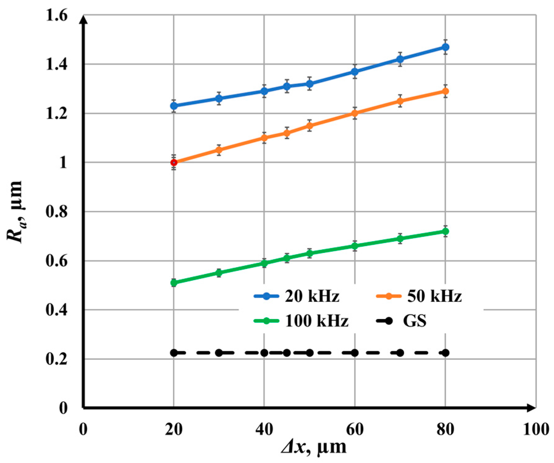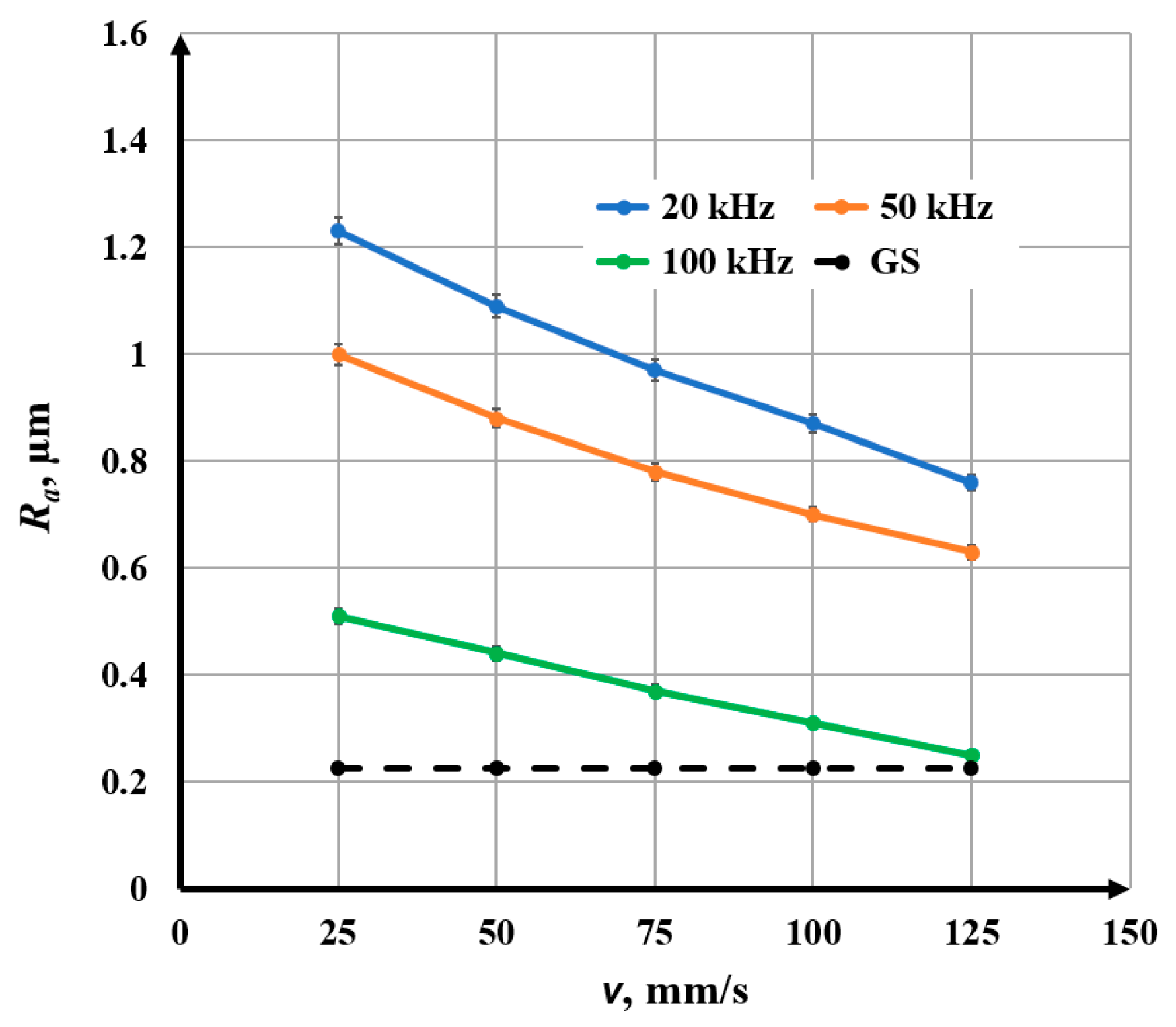 - For a frequency of 100 kHz and a speed of 25 mm/s, the roughness varies from 0.51 μm to 0.72 μm for the raster pitch interval from 20 μm to 80 μm. For a frequency of 100 kHz and a speed of 125 mm/s, the roughness varies from 0.25 μm to 0.48 μm for the investigated raster pitch interval;