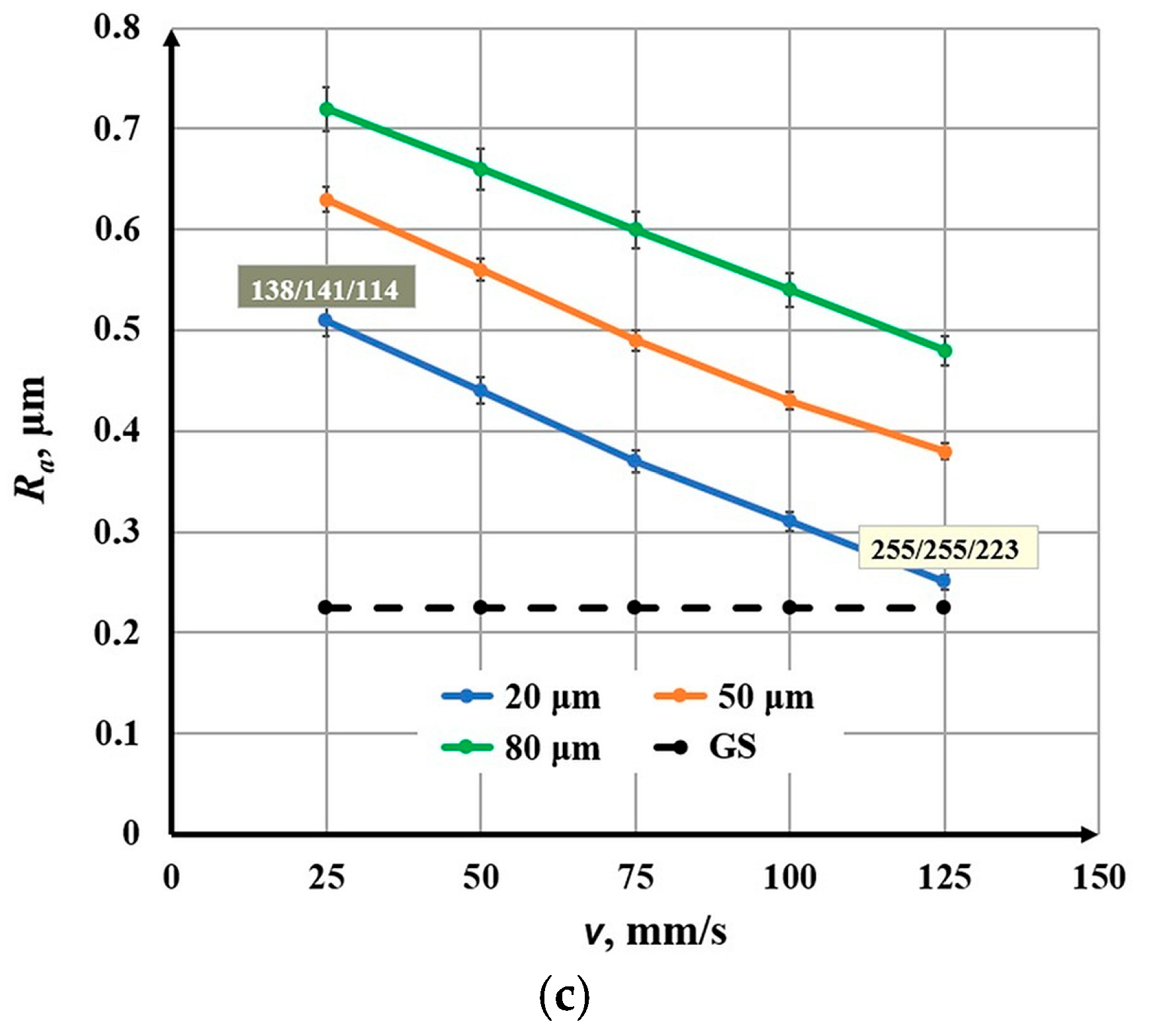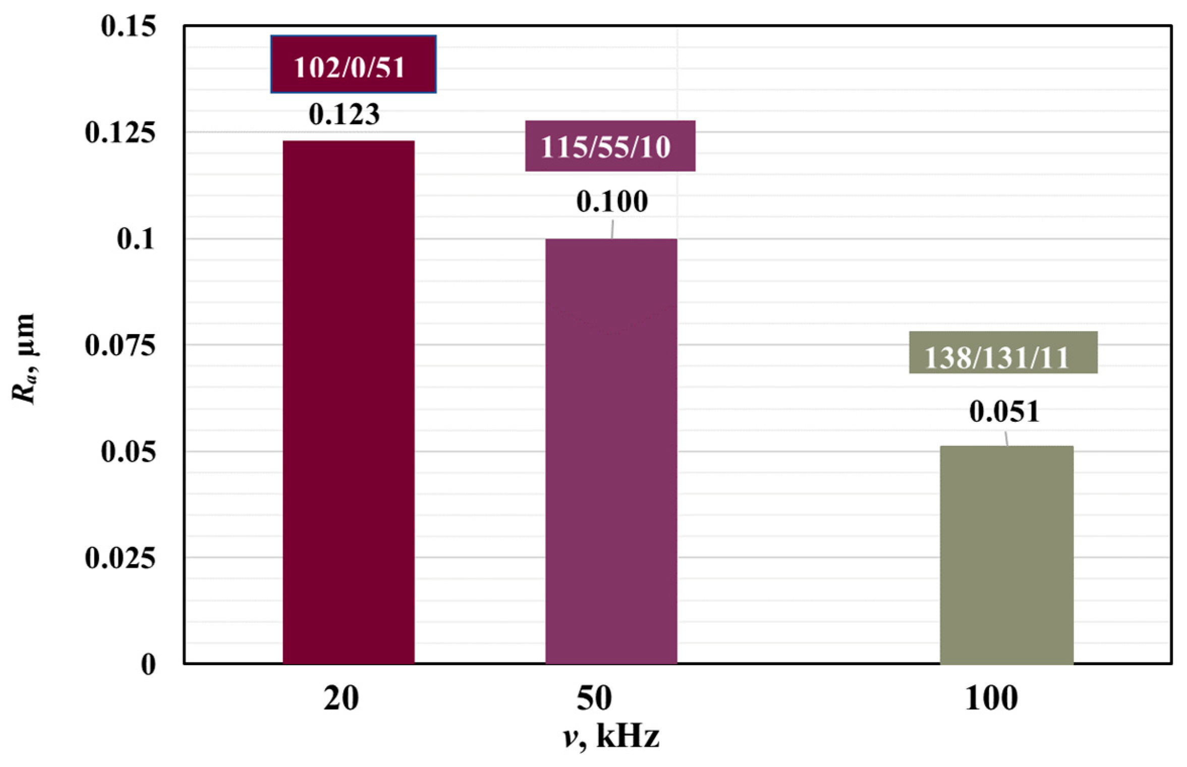 - For a frequency of 20 kHz and a raster step of 20 μm, the roughness decreases from 1.23 μm to 0.76 μm for the speed interval from 25 mm/s to 125 mm/s. For a frequency of 20 kHz and a raster step of 80 μm, the roughness decreases from 1.47 μm to 1.16 μm for the entire studied speed interval;