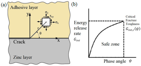 Key concepts of Interface Fracture Mechanics: (a) Stress field at a crack tip on the zinc–adhesive interface; (b) Energetic fracture criterion (fracture locus) showing the interfacial fracture toughness as a function of the phase angle [30].