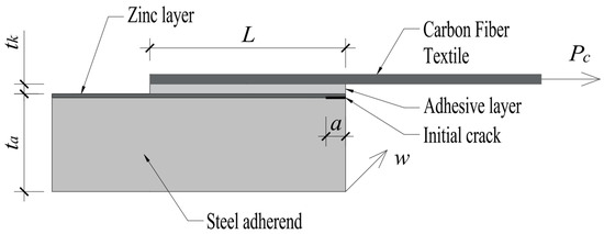 An initial short crack of length a is assumed to be located at the interface between the zinc layer and the adhesive, at one end of the overlap. The crack length a is one of the parameters in the analysis. All materials (steel, zinc, adhesive) are treated as linear elastic and isotropic. The mechanical properties of zinc and the adhesive are crucial for determining the interface parameters. The overlap length is denoted as , and the joint width as .