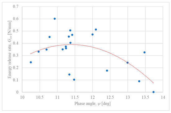As observed in Figure 3, the calculated phase angles () for the experimental failure points fall within a range of approximately 10° to 14°. While the individual data points show considerable scatter, varying from approximately 0.1 N/mm to over 0.5 N/mm, the addition of a polynomial trendline (red dotted line) reveals an underlying non-linear relationship. The trend suggests that the interfacial fracture toughness () is dependent on the phase angle, reaching a maximum value of approximately 0.4 N/mm at an optimal phase angle of around . For phase angles deviating from this optimum, the toughness appears to decrease. This parabolic trend is consistent with the theoretical framework of Interface Fracture Mechanics, although it is partially obscured by the significant experimental variability, which can be attributed to factors discussed in Section 5.2.