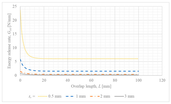 One can notice that for increased thickness of the steel adherend, the energy release rate is minimized for the whole considered range of overlap length. Another interesting observation is that the energy release rate becomes constant for overlap lengths greater than 20 mm.