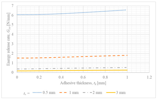 Influence of adhesive layer thickness () on the energy release rate () for different steel adherend thicknesses ().