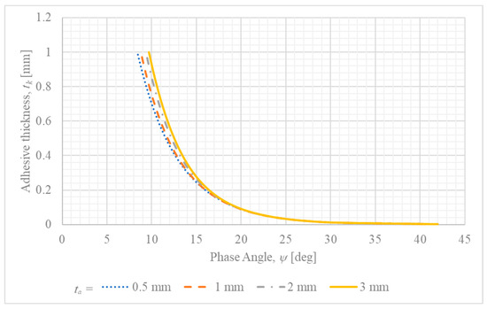 Figure 6 presents phase angle–adhesive thickness relationships ( vs. ) for different adherend thicknesses.
