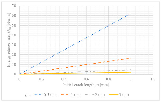 Sensitivity of the calculated energy release rate () to the assumed initial crack length () for different steel adherend thicknesses ().