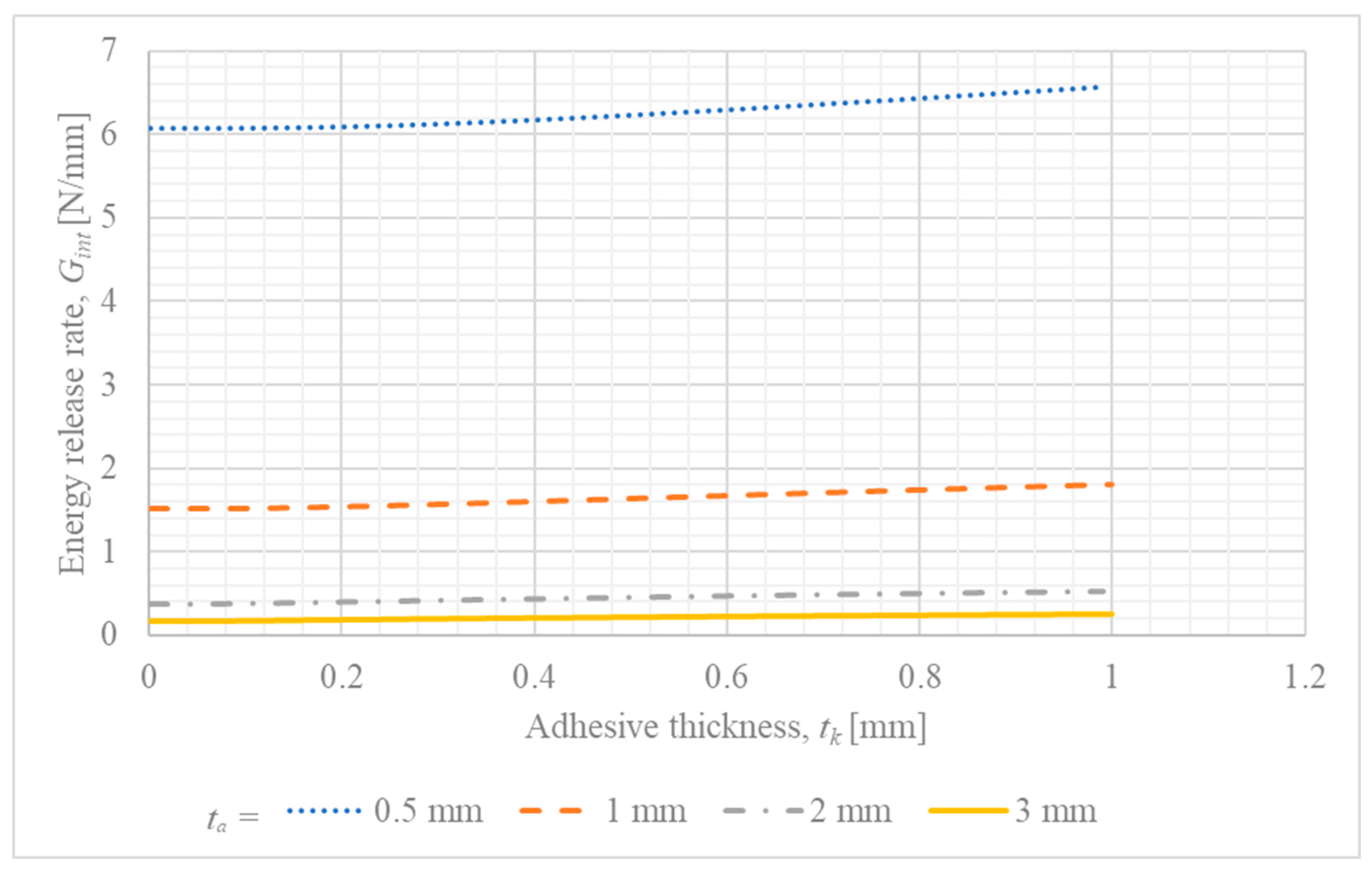 4.3. Influence of Adhesive Layer Thickness () on IFM Parameters