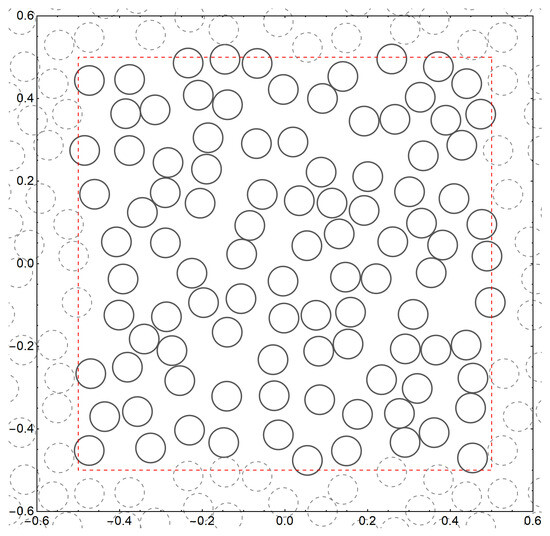 Double-periodic square cell shown with the red dashed lines. The dashed circles show disks that are periodically translated copies of the disks drawn with solid lines.