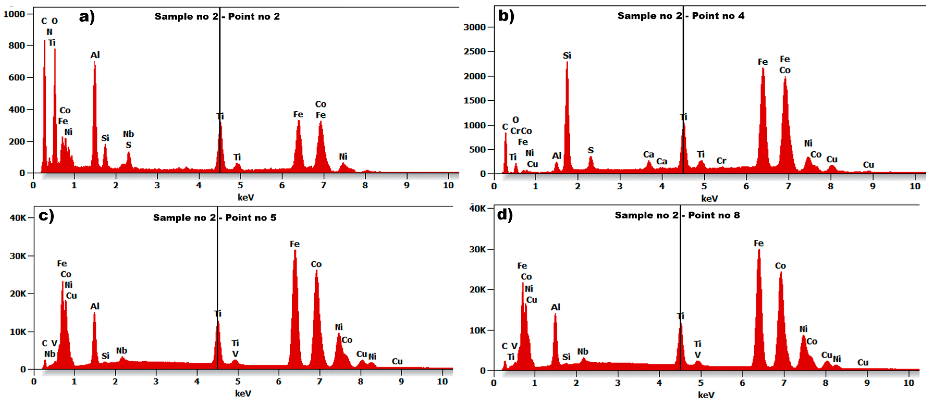 - Nieto, G.C.; Olvera, J.N.R.; Díaz de la Torre, S.; Febles, V.G.; Gómez, J.P.; Reyes, L.G.; Barriga Arceo, L.G.D. Microstructural and Morphological Properties of AlNiCo and CoNi Alloys: An In-Depth Study Based on Low-Energy Mechanical Alloying. Metals 2024, 14, 1307. [Google Scholar] [CrossRef]