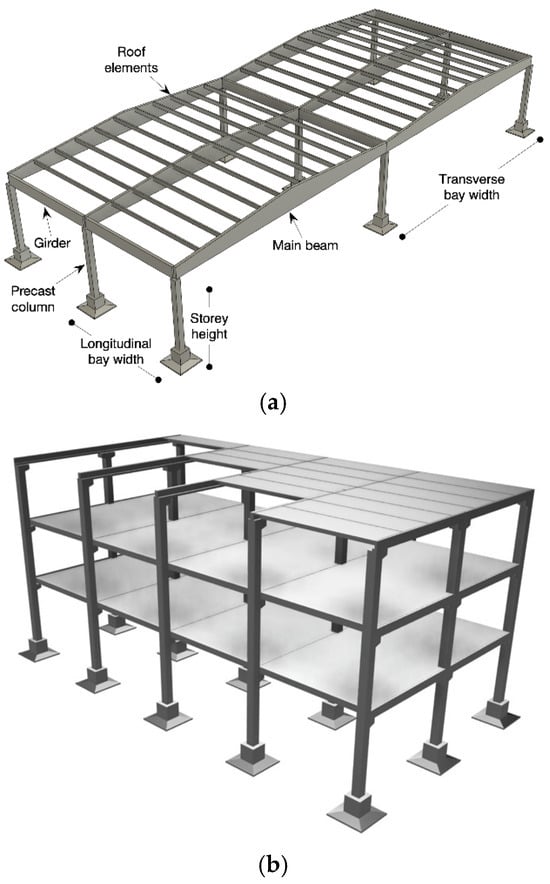 Common precast typologies in European industrial buildings: (a) single-storey precast and (b) multi-storey skeleton bearing frame structural typologies.