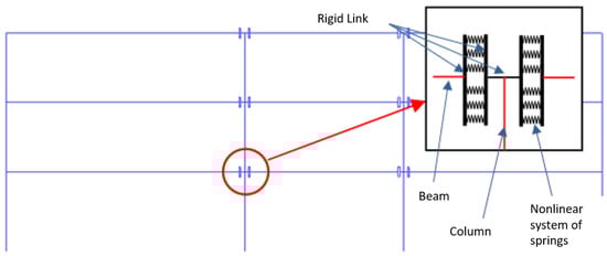 Given the nature of partial fixity at internal joints, the beam-to-column interface was modeled via a combination of vertical rigid links and parallel nonlinear springs (Figure 2), simulating the collective response of grouted socketed connections and embedded threaded bars. A unilateral constraint was introduced at the corbel to reflect realistic compression-only support and to capture the nonlinear flexural interaction. The frame was designed for a site in Gemona del Friuli (Udine Province, Northern Italy), characterized by soil type C and a peak ground acceleration (PGA) of 0.25 g according to local seismic zoning.