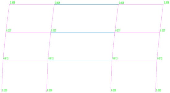 The initial design included column dimensions of 70 × 50 cm at the ground floor and 50 × 50 cm at the upper levels. However, stability checks under seismic loads revealed that the second and third-storey columns failed to meet the required stability criteria, while the ground-level columns required enhanced resistance verification. Since the equilibrium conditions necessitated the application of a uniform amplification factor () across all storeys, according to the NTC 2018 code [71] and also Eurocode [72], a global redesign of the column system was necessary. The final configuration, ensuring compliance with relevant code provisions [22], adopted uniform column dimensions of 80 × 80 cm across all levels. Figure 3 illustrates the deformed shape of the three-span frame incorporating the redesigned column dimensions, as obtained from the nonlinear analysis. The corresponding interstorey drifts at each level, ground, first, and second storey, are reported in Table 1, providing a quantitative assessment of lateral displacement demands. Additionally, Table 2 summarizes the results of the verification carried out for second-order effects (), highlighting the influence of the updated column dimensions on the overall stability and compliance with design code requirements.
