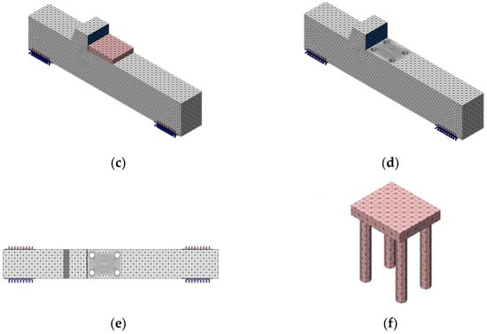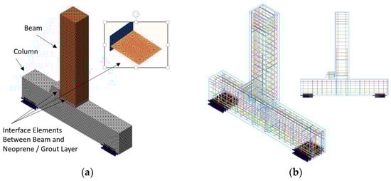 To simulate the potential interface behavior [74] between different materials, interface elements, similar in formulation to contact elements, were introduced (Figure 4c–f). These elements allowed for the simulation of separation and slip phenomena between the beam and the neoprene pad [61,74], as well as between the beam and the underlying grout layer, both of which are critical for capturing localized failure mechanisms and stress redistribution within the joint.