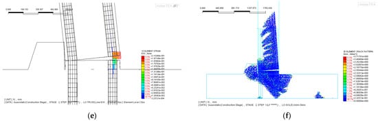 Finally, Figure 5e,f focus on the truss elements representing the bars passing through the grout interface, highlighting their stress state and the crack propagation behavior in the beam. The simulation results clearly show that significant tensile strains develop in these bars, indicating progressive bond degradation and crack widening. These observations are consistent with the hypothesis of partial flexure or yielding of the bars, an effect that, although not explicitly included in the current model, was later observed during experimental testing. Taken together, the numerical results provide strong evidence of the joint’s critical behavior under seismic loading and underscore the importance of conservative detailing to ensure robustness and prevent brittle failure modes.