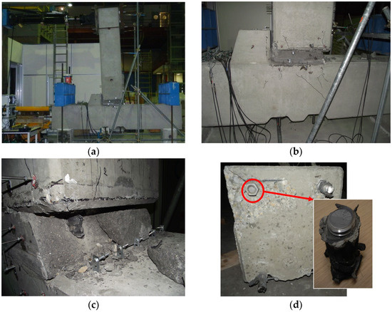 Experimental observations at advanced drift levels: (a) deformed shape of the beam at 3% drift, highlighting joint rotation and interface opening; (b) damage state at 3% drift, with visible cracking and grout detachment; (c) close-up view of the expelled and damaged concrete fragment at the beam–column interface; (d) fractured threaded bar segment observed at 4% drift, showing tensile rupture and residual bending.