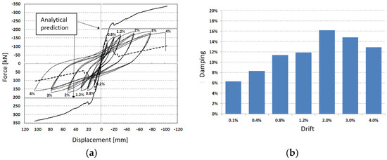 Experimental vs. numerical prediction (a) and damping values vs. drift level (b).